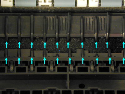 2. 使用棉花籤小心地清潔突出處周圍的墨水,如下圖藍色箭頭指示。