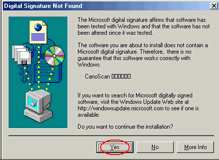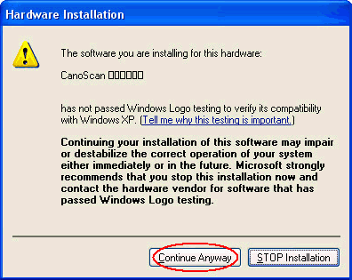 在此視窗中,會出現訊息「繼續安裝該軟體會使您的系統操作不穩定或受損/無法保證該軟體在 Window 下可以正常工作」,但是按一下 [仍然繼續/是] 按鈕後,可以繼續正常安裝。操作不受影響,掃描器可以正常使用。