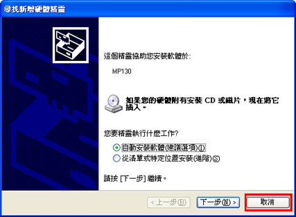 如果看見[尋找新硬體精靈],則已經連接了 USB 電纜線。請斷開 USB 電纜線連接,然後按一下[取消]。