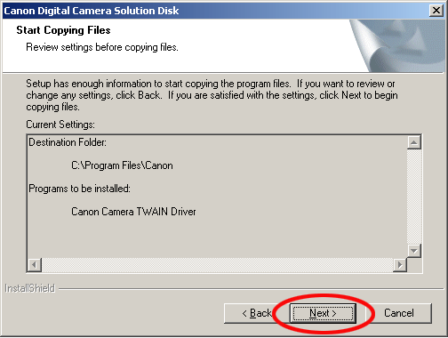 28. 在[開始複製檔案(Start Copying Files)]對話方塊中確認安裝的內容,並按一下[下一步(Next)]。