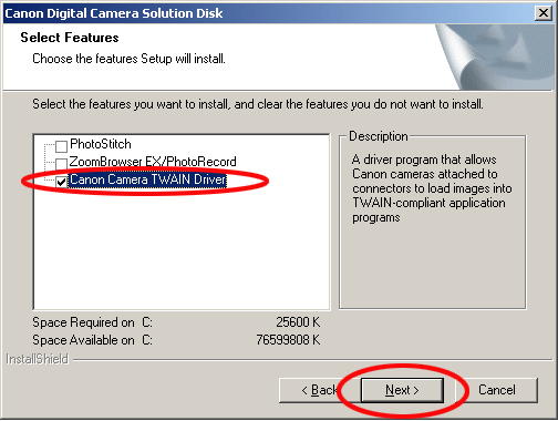27. 在[選擇功能(Select Features)]對話方塊中只按一下[佳能相機 TWAIN 驅動程式(Canon Camera TWAIN Driver)]核選方塊,然後按一下[下一步(Next)]。