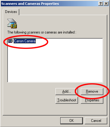 7. 從[掃描儀及相機(Scanners and Cameras)]中選擇您的相機型號名稱或[佳能相機(Canon Camera)],然後按一下[移除(Remove)]。