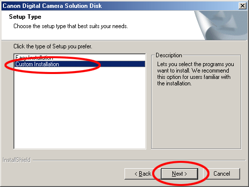 選擇[自訂安裝(Custom Installation)],然後按一下[下一步(Next)]。