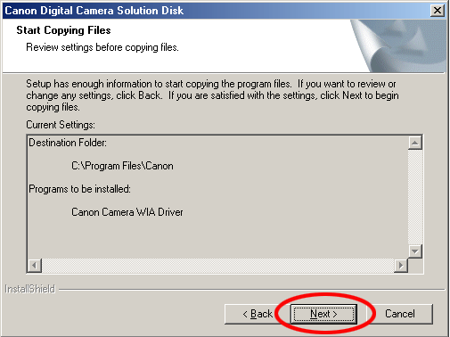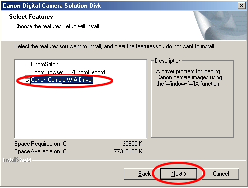 只按一下[佳能相機 WIA 驅動程式(Canon Camera WIA Driver)]核選方塊核選方塊,然後按一下[下一步(Next)]。