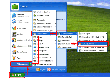 如果「CameraWindow」未自動出現,按[開始(Start)]按鈕,然後依次序選擇[所有程式(All Programs)]或[程式(Program)]、[Canon Utilities]、[CameraWindow]及[CameraWindow]以開啟「CameraWindow」。