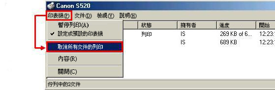 2-1. 按一下「印表機」,然後按一下「取消所有文件」。