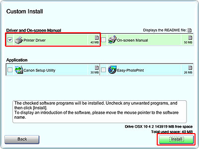 「自訂安裝(Custom Install)」允許用戶從印表機驅動程式、應用軟體和電子說明書中選擇要安裝的軟體程式集。