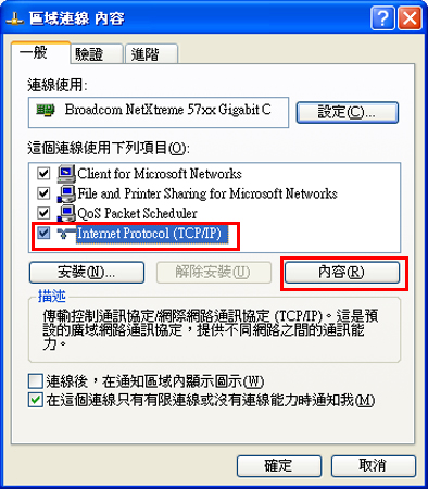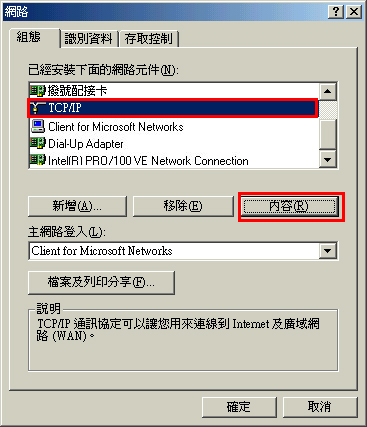 7. 「已經安裝下面的網路元件」中選取 TCP/IP ,按一下[內容]。