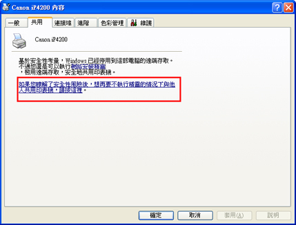 5. 顯示「Canon iP4200 內容」視窗時,按一下「如果您瞭解了安全性風險後,想再要不執行精靈的情況下與他人共用印表機,按一下這裡。」