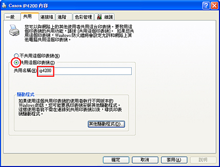 7. 顯示「Canon iP4200 內容」視窗時,選擇「共用這個印表機」並在「共用名稱」文本框中輸入名稱。