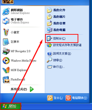 1. 按一下「開始」及「控制台」。