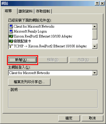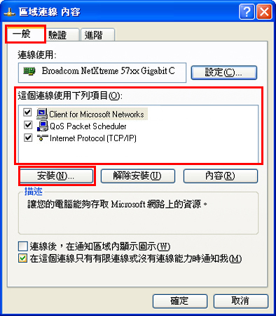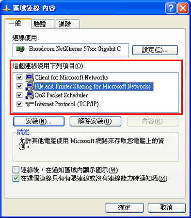 8. 當再次顯示「區域連線內容」視窗時,確認「Microsoft 網路的檔案和印表機共用(File and Printer Sharing for Microsoft Networks)」已經添加。