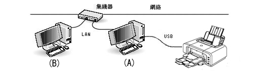 下文中,與共用印表機相連的電腦(A)簡稱為「列印伺服器」,新增的電腦(B)簡稱為「客戶機」。