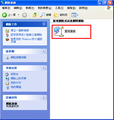4. 顯示「網路連線」視窗時,右鍵按一下「區域連線」,然後按一下「內容」。