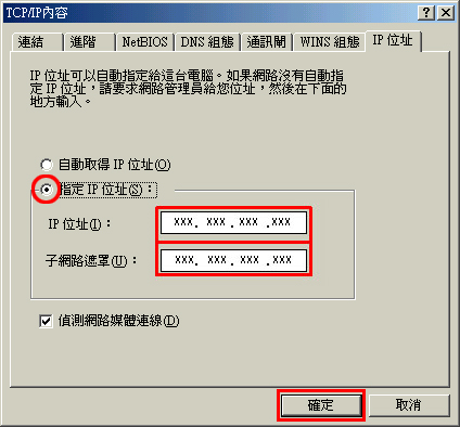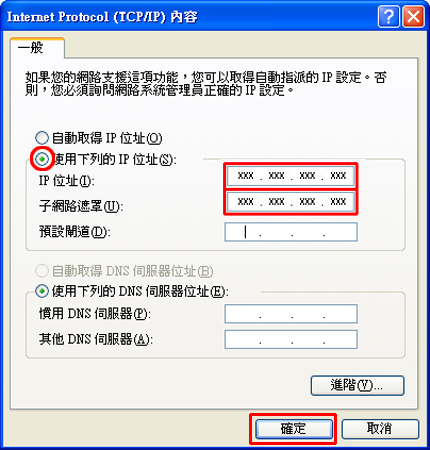8. 顯示「TCP/IP 內容」視窗時,輸入 IP 位址及子網路遮罩,按一下[確定]。
