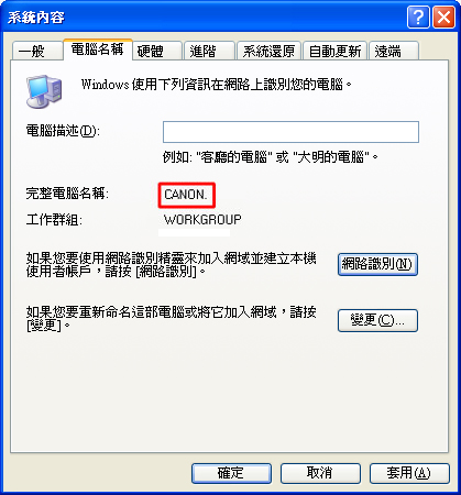 2. 顯示「系統內容」視窗時,按一下「電腦名稱」標籤,檢查確認「完整電腦名稱」中的「CANON」和「工作群組」中的「WORKGROUP」。在客戶機中指定印表機共用設定時需要使用這些名稱。