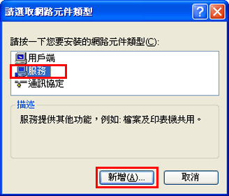 6. 當顯示「請選取網路元件類型」視窗時,選擇「服務」,然後按一下[新增]。