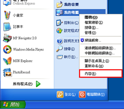 1. 右鍵按一下「我的電腦」,然後按一下「內容」。
