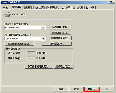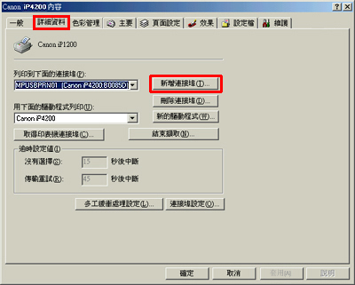 3. 顯示「Canon iP4200 內容」視窗時,選取「詳細資料」標籤,按一下「新增連接埠」。