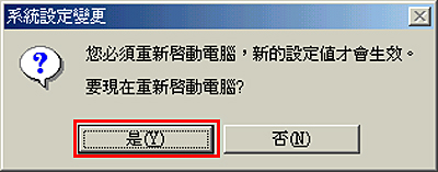10. 顯示「系統設定變更」視窗時,按一下[是]重啟電腦。