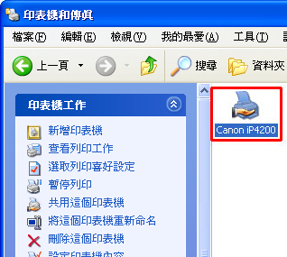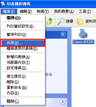 4. 顯示「印表機和傳真」視窗時,選擇 Canon iP4200 ,然後從「檔案」功能表中按一下「共用」。