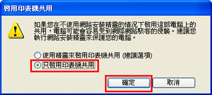 6. 顯示「啟用印表機共用」視窗時,選擇「只啟用印表機共用」,然後按一下[確定]。