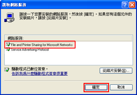 7. 當顯示「選取網路服務」視窗時,選擇「Microsoft 網路的檔案和印表機共用(File and Printer Sharing for Microsoft Networks)」,然後按一下[確定]。