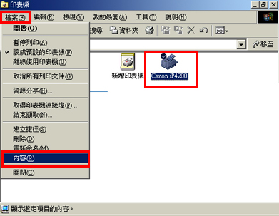 2. 顯示「印表機」視窗時,選擇 Canon iP4200 ,然後從「檔案」功能表中按一下「內容」。