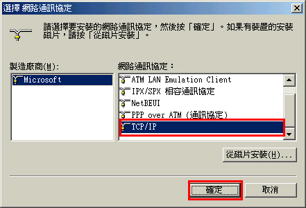 4. 當顯示「選擇網路通訊協議」視窗時,選取「TCP/IP」並按一下[確定]。