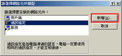 3. 當顯示「請選取網路元件類型」視窗時,選擇「通訊協議」,然後按一下[新增]。