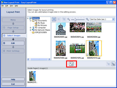 選擇要列印的影像並按一下「導入內頁(Import to Inside Pages)」,影像將顯示在所選擇的影像區域內。