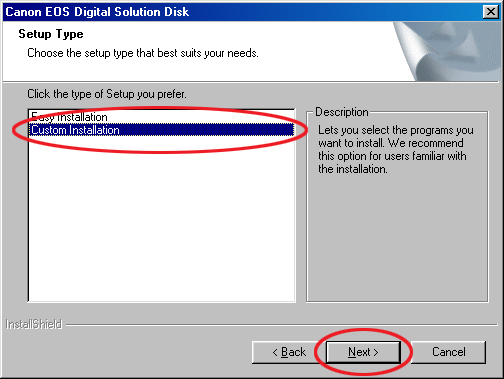 5. 在 [安裝類型 (Setup Type)] 螢幕上,選擇 [自訂安裝 (Custom Installation)],然後按一下 [下一步 (Next)]。