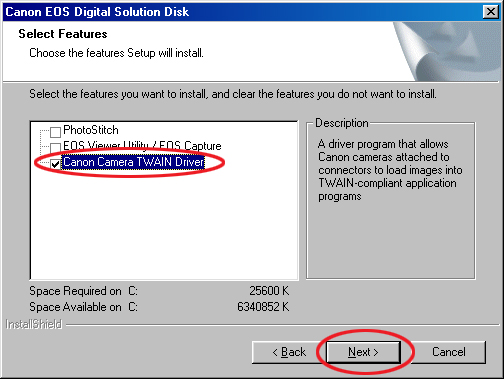 8. 在 [選擇功能 (Select Features)] 螢幕上,確保僅選擇 [佳能相機 TWAIN 驅動程式 (Canon Camera TWAIN Driver)] 核選方塊,然後按一下 [下一步 (Next)]。