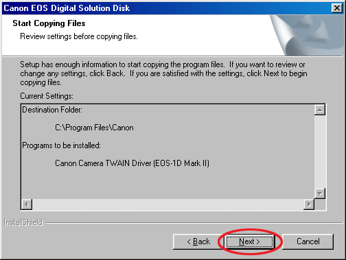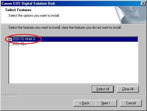 9. 在 [選擇功能 (Select Features)] 螢幕中,按一下 [EOS-1D Mark II] 核選方塊,然後按一下 [下一步 (Next)]。