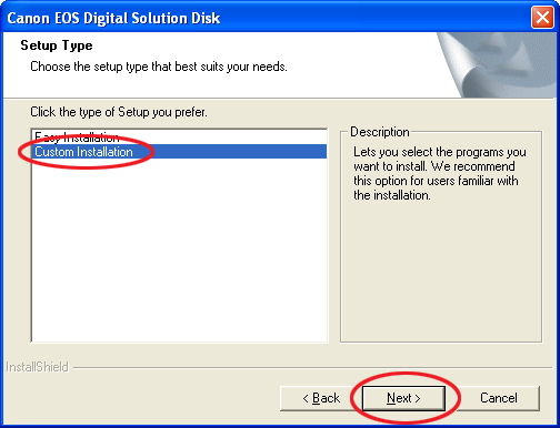 5. 在 [安裝類型 (Setup Type)] 螢幕上,選擇 [自訂安裝 (Custom Installation)],然後按一下 [下一步 (Next)]。