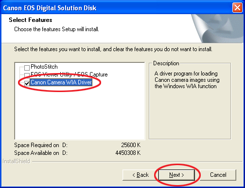 8. 在 [選擇功能 (Select Features)] 螢幕上,確保僅選擇 [佳能相機 WIA 驅動程式 (Canon Camera WIA Driver)] 核選方塊,然後按一下 [下一步 (Next)]。