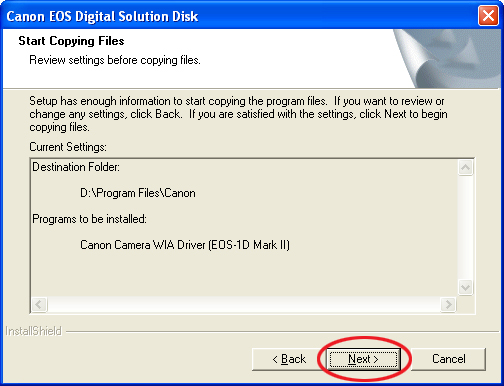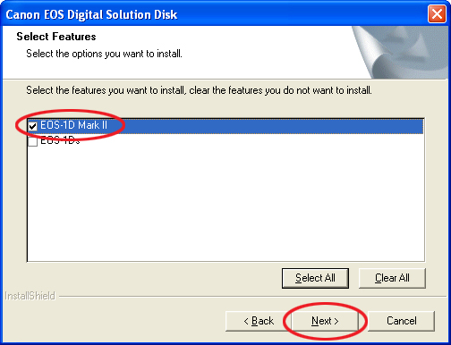 9. 在 [選擇功能 (Select Features)] 螢幕中,按一下 [EOS-1D Mark II] 核選方塊,然後按一下 [下一步 (Next)]。