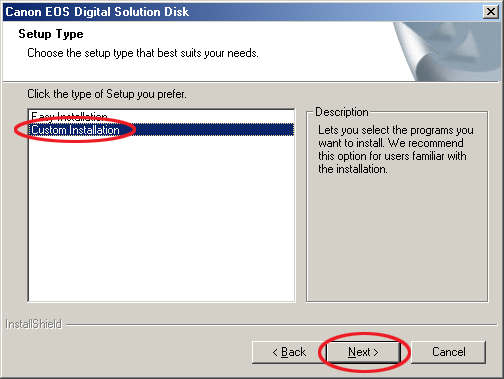 5. 在 [安裝類型 (Setup Type)] 螢幕上,選擇 [自訂安裝 (Custom Installation)],然後按一下 [下一步 (Next)]。