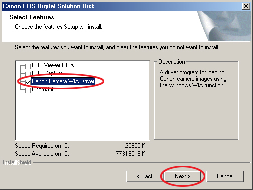 8. 在 [選擇功能 (Select Features)] 螢幕上,確保僅選擇 [佳能相機 WIA 驅動程式 (Canon Camera WIA Driver)] 核選方塊,然後按一下 [下一步 (Next)]。
