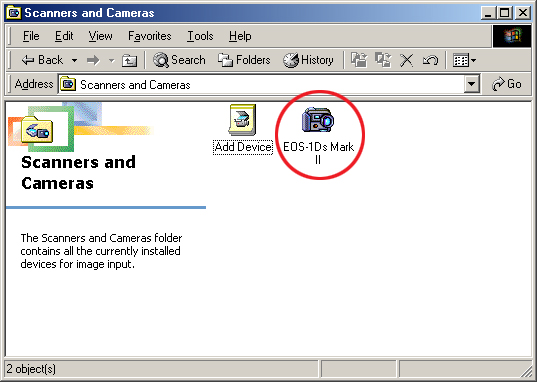 如果 [EOS-1Ds Mark II] 未出現在 [掃描器和相機] 視窗中,請關閉該視窗,然後轉到步驟 12。