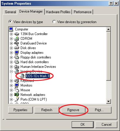 13. 使用以下步驟刪除 [裝置管理員] 對話方塊中顯示的 [EOS-1Ds Mark II] 或 [佳能數碼相機]。