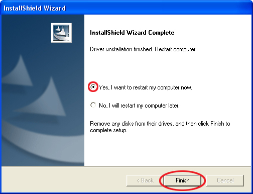 4. [InstallShield 精靈完成 (InstallShield Wizard Complete)] 對話方塊出現時,選擇 [是,立即重新啟動電腦。(Yes, I want to restart my computer now.)],然後按一下 [完成 (Finish)] 重新啟動電腦。