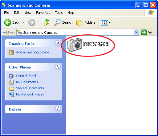 如果 [EOS-1Ds Mark II] 未出現在 [掃描器和相機] 視窗中,請關閉該對話方塊,然後轉到步驟 12。