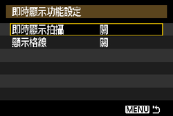 7. 按<SET>按鈕。請確保[即時顯示拍攝-啟動]設定完成,然後按兩次<MENU>按鈕。