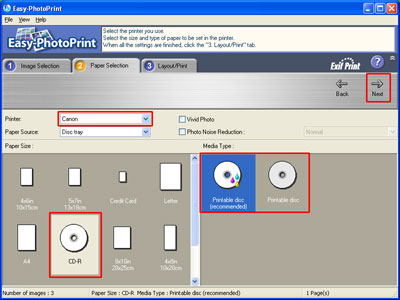 2. 在「2. 紙張選擇(Paper Selection)」標籤上,設定「印表機(Printer)」、「紙張大小(Paper Size)」及「媒體類型(Media Type)」。