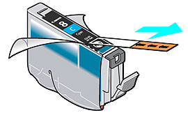 6. 拆開墨水盒包裝,按箭頭所示方向取下橙色膠帶,然後拆除薄膠片帶。