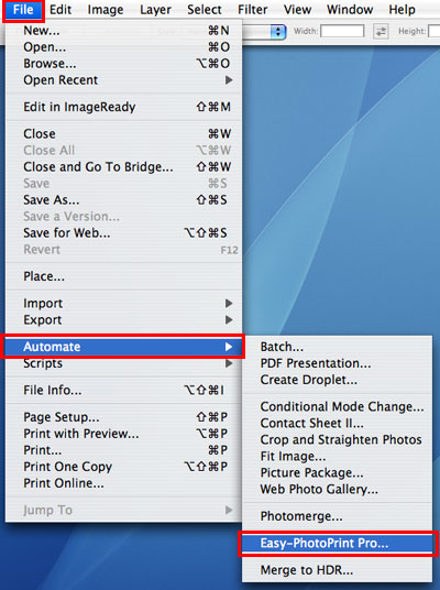 從「Adobe Photoshop」的「檔案(File)」功能表中,選擇「自動(Automate)」,然後開啟「Easy-PhotoPrint Pro」。