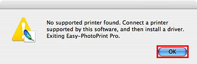 - 如果未安裝支援「Easy-PhotoPrint Pro」的印表機驅動程式,將顯示下列錯誤訊息,且不能啟動「Easy-PhotoPrint Pro」。安裝支援「Easy-PhotoPrint Pro」的印表機驅動程式。