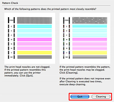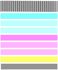 7. 列印「噴嘴檢查圖案(Print Check Pattern)」後,請參閱步驟 5< 如何列印「噴嘴檢查圖案(Nozzle Check Pattern)」 >檢查是否堵塞列印頭噴嘴。