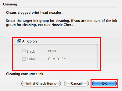 - 按一下[最初確認項目(Initial Check Items)]時,將在執行「清潔(Cleaning)」前顯示確認項目。